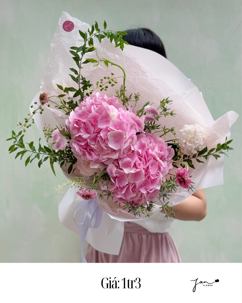 Bó hoa tone hồng mix, tú cầu, scabiosa, hoa phăng – V065