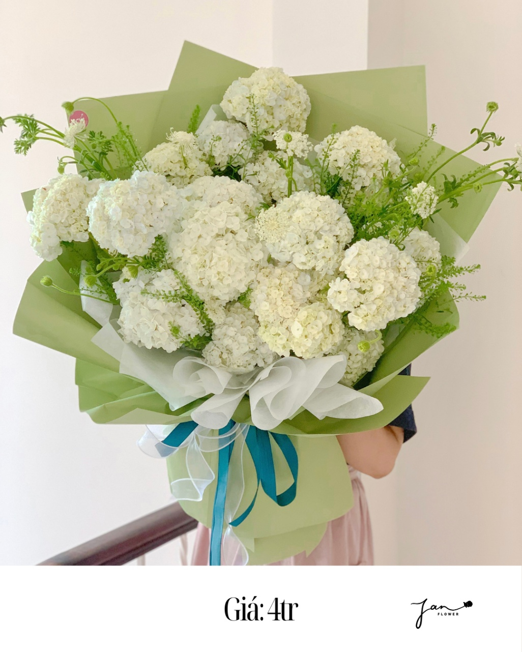 Bó tone trắng xanh lá mix hoa tú cầu và thúy châu – V074