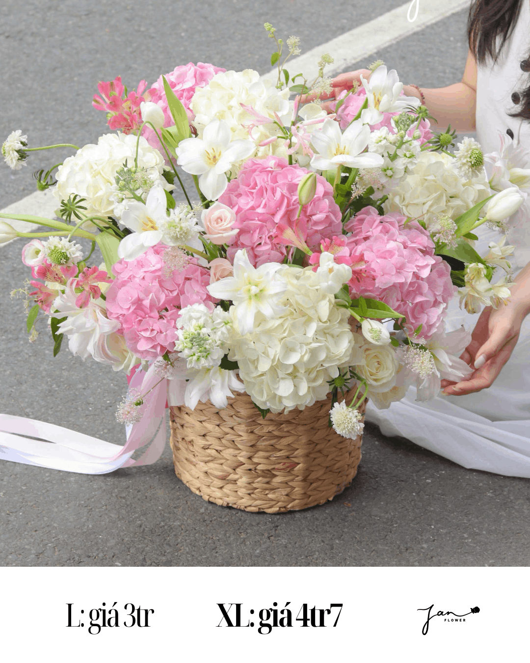 Giỏ hoa size XL tone hồng trắng mix tú cầu, tulip, ly kép, hoa hồng, scabiosa – V090