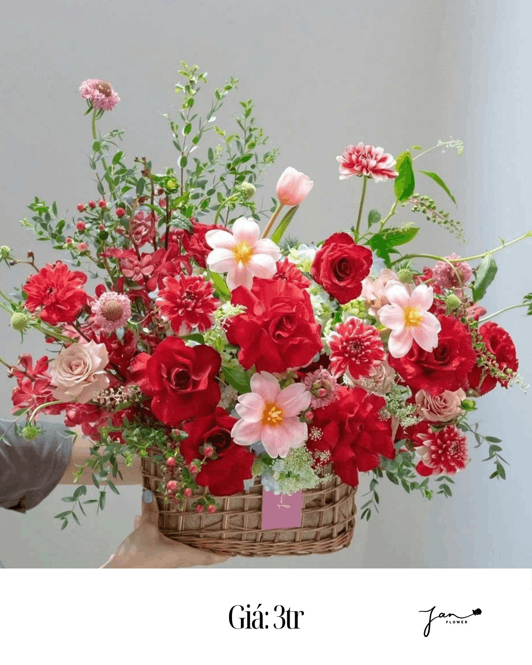 Giỏ hoa tone đỏ mix hoa hồng, tulip, thược dược, lan mokara – V087
