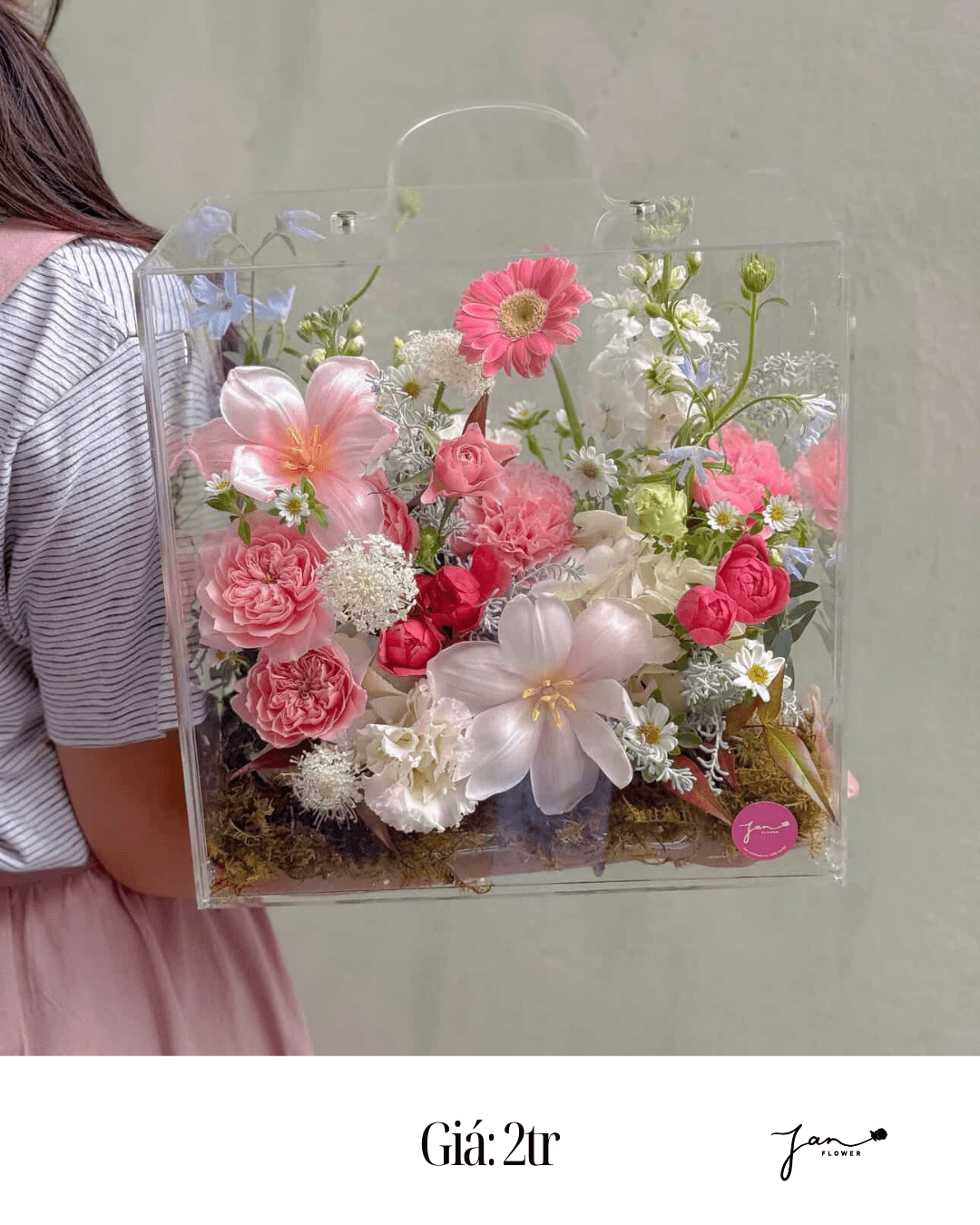 Hộp hoa mica tone hồng mix hoa hồng, tulip, cát tường phăng, thúy châu, tiểu delphin – V115