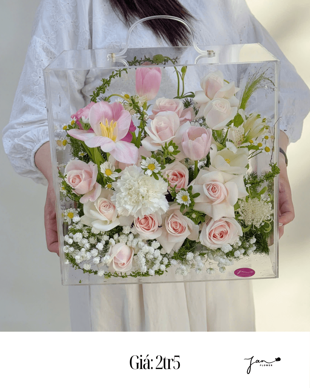 Hộp hoa mica tone trắng hồng mix hoa hồng, tulip, phăng, hoa baby, thủy tiên – V118