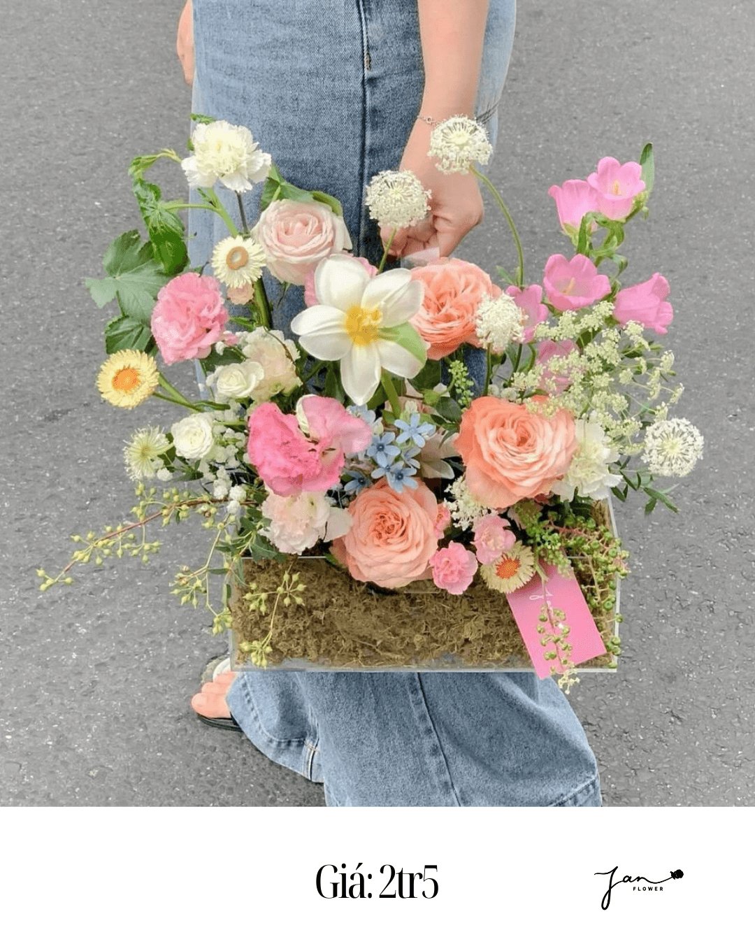 Hộp hoa tone hồng cam mix hoa hồng, tulip, hoa chuông, cát tường, phăng, thúy châu – V121
